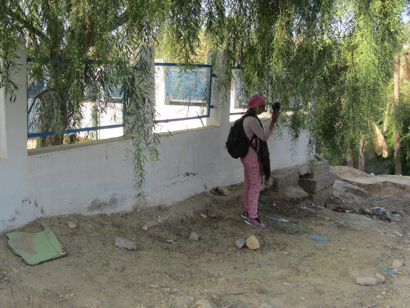 On est dans l’espace agricole de l’oasis. C’est très calme. Les sons de la ville sont de plus en plus masqués. Ici, l’eau coule depuis le forage profond qui alimente l’oasis. L’eau domine l’espace sonore. Les insectes, surtout les mouches, sont présents.