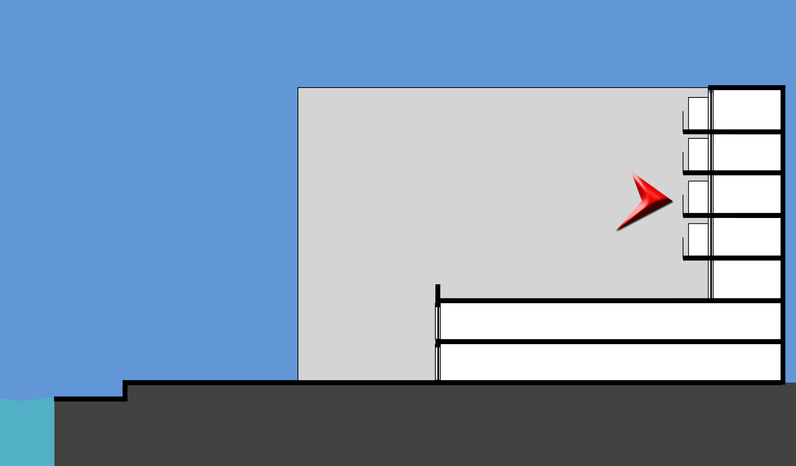 Petit balcon en saillie de 4m x 1,5m, à environ 12m depuis la rue, dans un coeur d’ilot en «U» ouvert sur un canal fluvial.