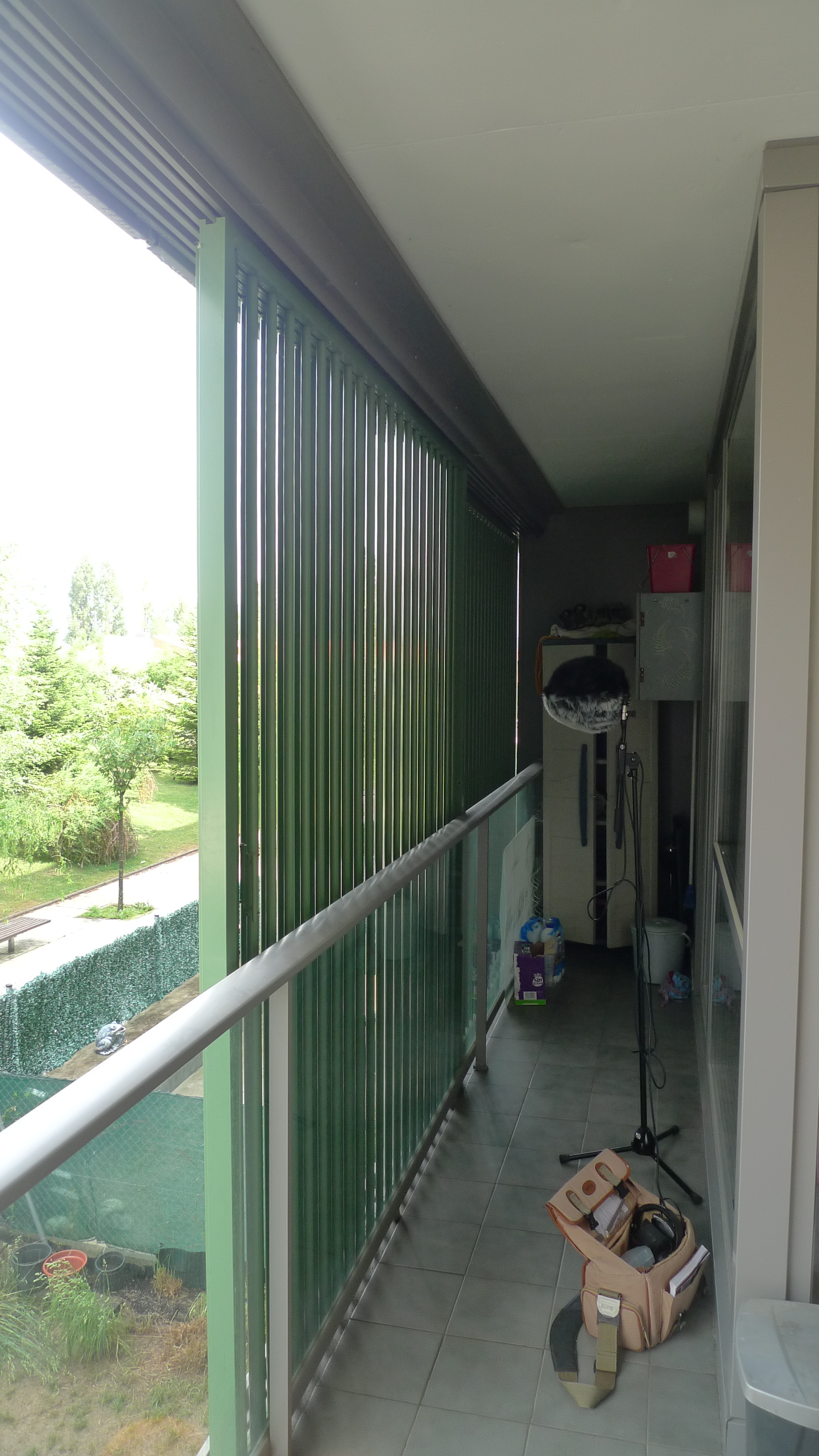 Balcon quasi-loggia en empilement à R+1. Fragment sonore resituant l'ambiance sonore du lieu, panneaux ouverts, puis fermés partiellement, puis fermés complètement. Les panneaux articulés agissent faiblement selon leur position sur la circulation sonore sur le balcon, en confinant un peu les sons micro-locaux ou en filtrant modérément les sons d’en-bas. La conversation dans l’appartement est très atténuée par un double vitrage efficace. A l'extérieur, sons urbains distants, lointains de la rocade, ambiance large avec les jeux d’enfants du parc ou dans les jardinets, chants d’oiseaux et chants des grenouilles dans la fontaine paysagée. Sur la balcon, le chien rêve, se réveille aux sons inquiétants et révèle l'espace de la place publique.