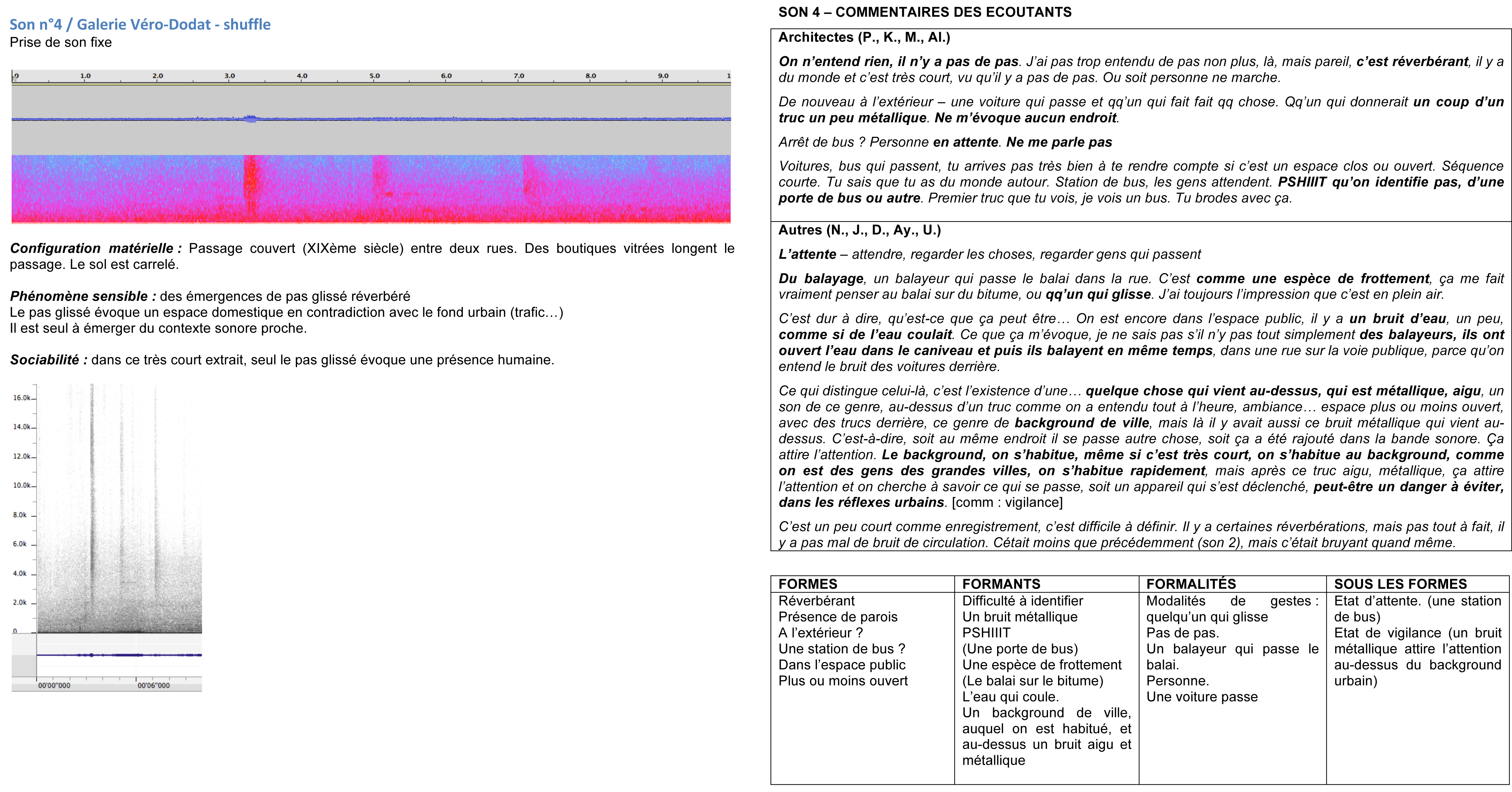 Des émergences de pas glissé réverbéré. Le pas glissé évoque un espace domestique en contradiction avec le fond urbain (trafic…). Il est seul à émerger du contexte sonore proche.