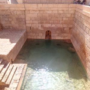 Un lieu principalement piéton, constitué de plusieurs plateformes, entouré de constructions présentant un langage architectural sobre, vernaculaire, à un ou deux niveaux. Trois grands palmiers et deux arbres offrent des zones d’ombres où un groupe d’homme s'y est installé autour d’une table probablement ramenée du café tandis qu'un autre groupe de trois personnes s'est placé sur un bac à fleur adossé au mur du musée. Deux grands bassins d’eau s'imposent au lieu. L’eau est assez profonde et je n’en ai pas une vision directe. En avançant de quelques pas vers le plus petit bassin, qui se trouve juste devant moi, j’aperçois l’eau dont la profondeur avoisine trois ou quatre mètres. L’eau est cristalline, propre et scintillante sous le soleil brulant. Quelques rochers pointent à l’extrémité du bassin. J’entends le bruit de l’eau qui jaillit d’une niche dans le mur est du bassin et qui s’écoule vers le deuxième bassin à travers un souterrain. Un son assez doux qui se joint aux chants d’oiseaux pour former un fond sonore agréable. Au nord de la place, des emmarchements assez larges mènent vers le musée et le poste de police. Le ciel est dégagé. La lumière naturelle envahit la place. Une moto est stationnée en contrebas de la terrasse du café. Une autre au milieu de la place, adossée aux larges escaliers. Des files de câbles électriques traversent le passage entre les deux bassins. Quelqu’un, probablement un baigneur, y a accroché sa serviette. Devant moi neufs jeunes hommes, dont sept sont vêtus comme s’ils étaient à la plage. Un contraste saisissant au cœur d’un cadre urbain médinal, au sud tunisien, à la porte du Sahara. Ils discutent, se penchent pour voir ce qui se passe au fond du deuxième bassin, le plus grand. Ils observent les personnes qui ont plongé du haut de « Dar El-Bey ». Je les entends crier, barboter et s’amuser dans l’eau.